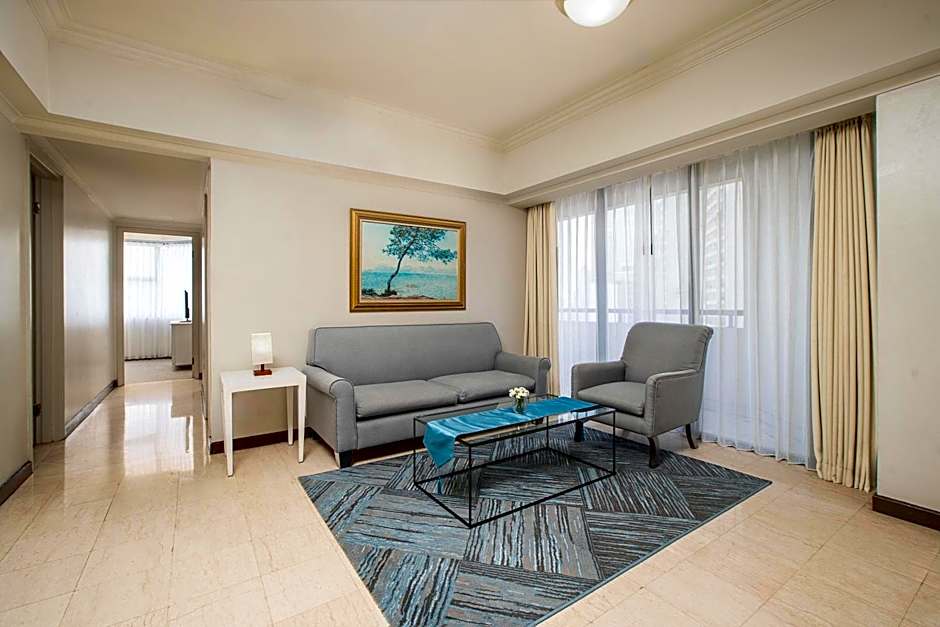 A spacious suite which comes with upgraded amenities. Ironing facilities and a washing machine are available on request. It offers views of Jakarta City and the pool.